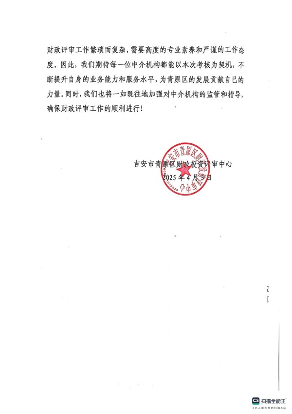 近日,青原区财政投资评审中心公布了2024年度财政入库中介机构考核结果,我司凭借扎实的专业能力和优质的服务质量,以94.49分的成绩位列优秀机构,排名首位。